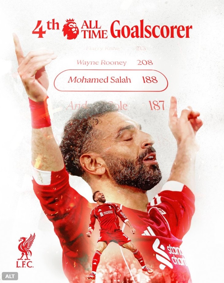 萨拉赫188球独占英超历史射手榜第四位,利物浦官推晒海报纪念